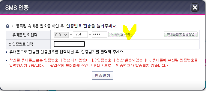 발송 버튼을 누면 다음과 같은 SMS 인증 화면이 보입니다. 인증번호 전송을 클릭합니다.