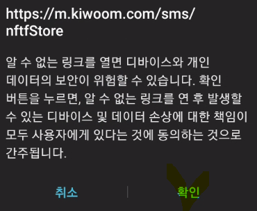 저에게 발송된 문자는 다음과 같습니다. 문자 안에는 키움 다운로드 화면 이동 링크가 있습니다.