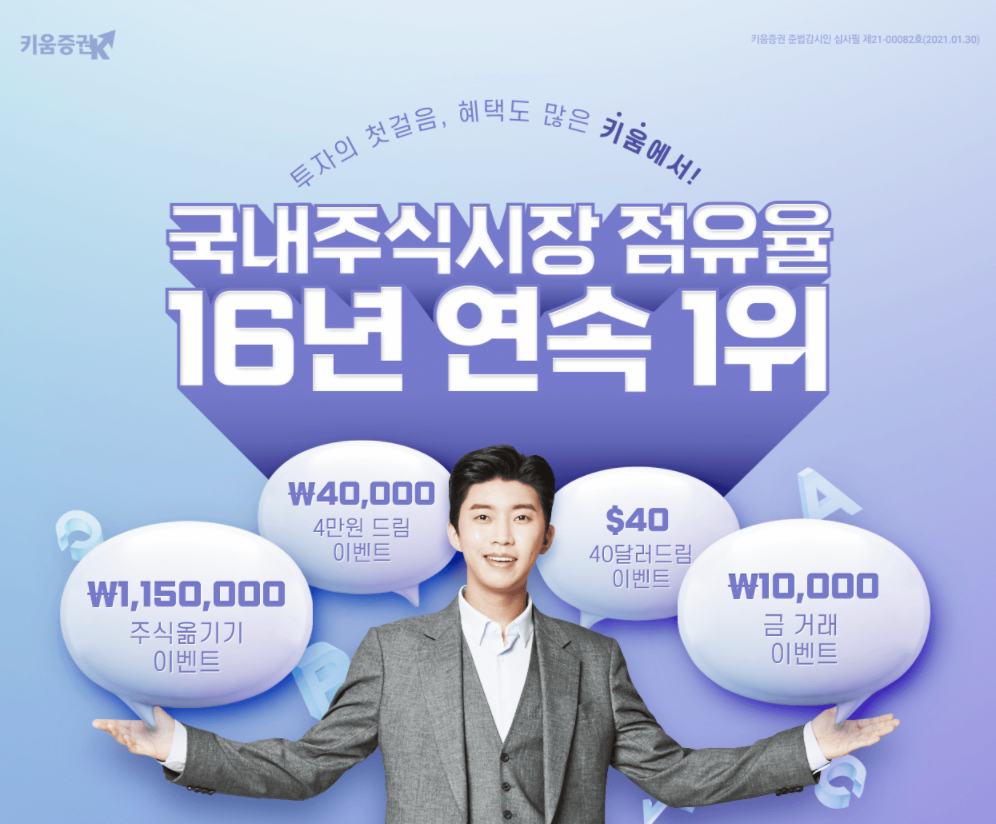 국내 주식시장 점유율 16년 연속 1위라고 홍보하는 키움증권이 여러 개의 이벤트를 진행 중에 있습니다. 영웅문이란 트레이딩 시스템으로 유명한 키움증권은 국내 주식거래 비중이 거래대금으