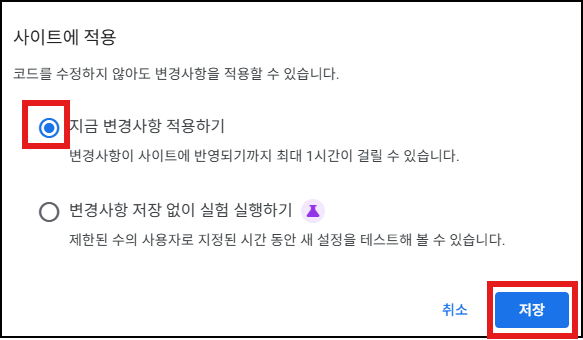 사이트에 적용은 지금 바로 변경사항을 적용하거나 변경사항 저장 없이 실험을 실행하는 방법이 있으나 오늘은 바로 변경을 적용하도록 하겠습니다. 바로 적용하더라고 실제 앵커 광고 해제에 걸리는 시간은 최대 1시간 정도 걸릴 수 있다고 합니다.