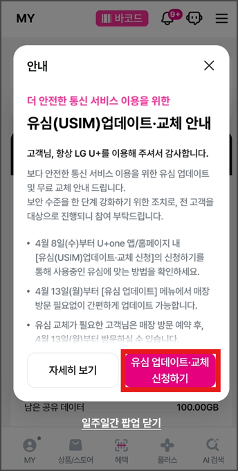 현재 유플러스 원 앱을 시작하자마자 바로 유심 업데이트 또는 교체에 대한 아내문을 팝업으로 바로 확인하실 수 있습니다. 자세히 보기를 하시거나 바로 '유심 업데이트/교체 신청하기'로 이동하실 수 있습니다.