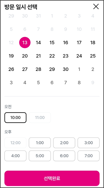 매장을 선택하셨다면 이어서 방문 일시를 선택합니다. 달력에서 요일을 클릭한 다음 가능한 일시 중 오전과 오후에서 선택하고 '선택완료' 버튼을 눌러 팝업창에서 예약하기 버튼을 다시 눌러주세요. '방문 신청이 완료되었습니다'라는 화면을 확인하시면 지금까지의 모든 과정이 완료됩니다.