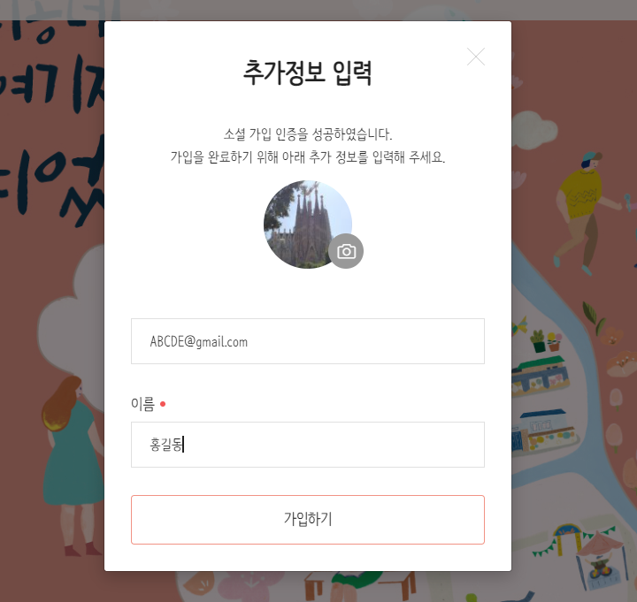 다음 추가정보 입력화면에서 이메일과 이름을 기입해주고 "가입하기" 버튼을 클릭합니다.