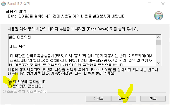 다음과 갗이 BANDI 설치 프로그램 전용창이 열리면 "다음"을 눌러 진행합니다.