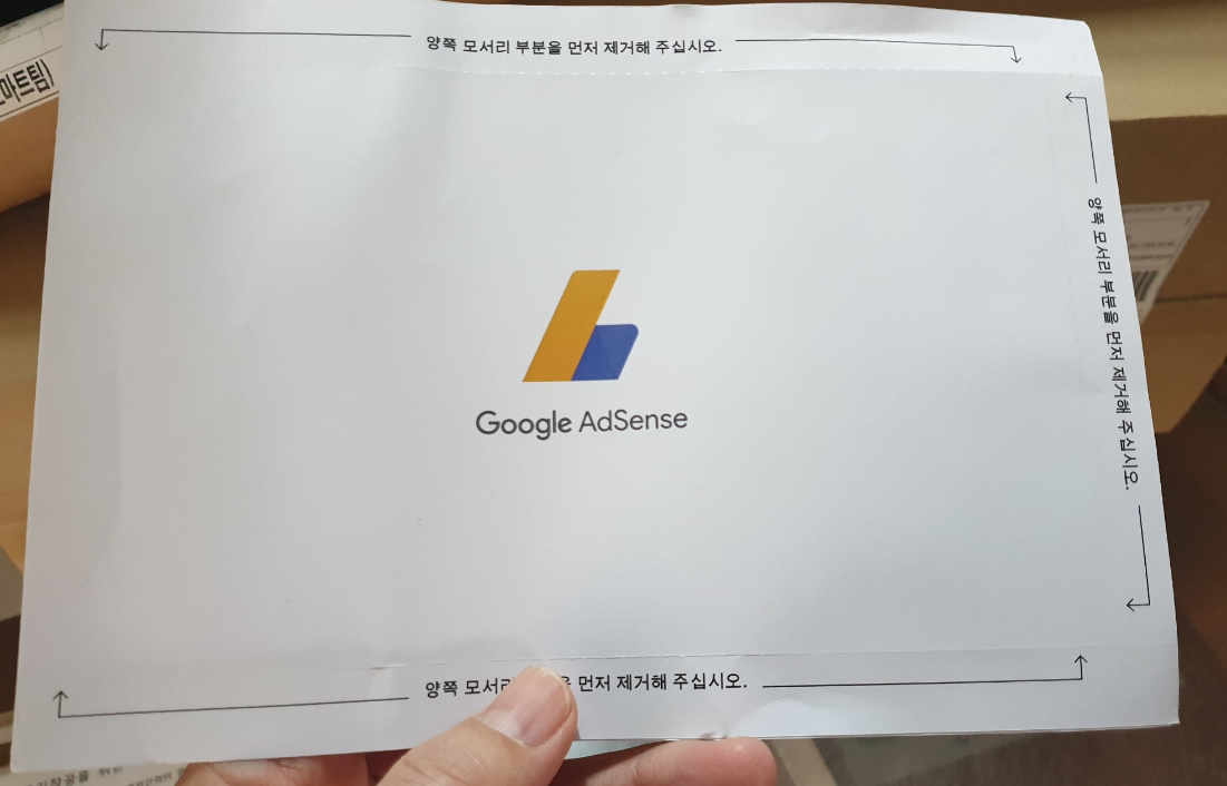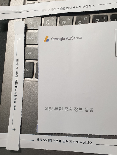 그럼 구글 애드센스 핀 PIN 번호를 확인하기 위해서 봉투 세군데 모서리를 모두 제거했으니 이제는 안쪽에 어떤 내용이 있는지 보겠습니다.