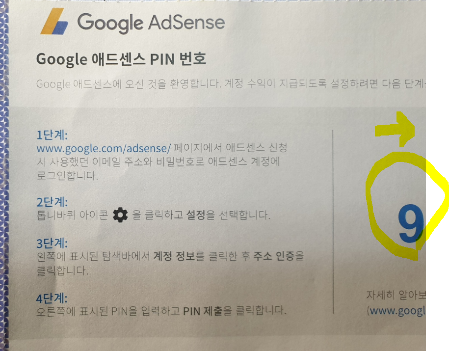1) 구글 애드센스 핀 PIN 번호 앞면