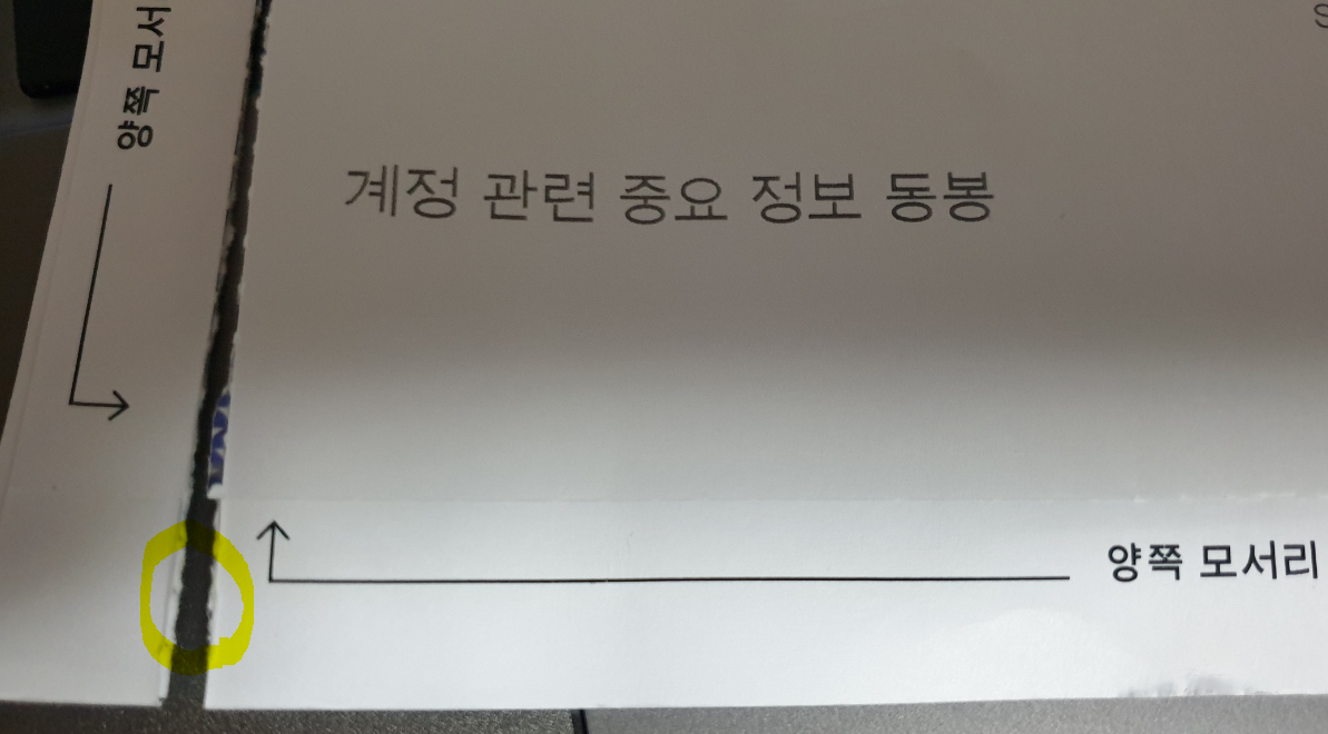 역시 양쪽 모서리 부분을 먼저 제거해 주십시요. 라는 문구가 네 군데 모서리 중 좌측 모서리를 제외하고 세 군데에 인쇄되어 있습니다.