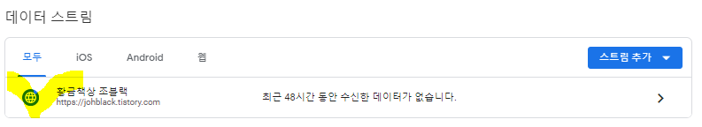 데이터 스트림 목록에서 본인의 티스토리 블로그 URL이 등록되어 있는 해당 스트림을 찾아 클릭합니다.