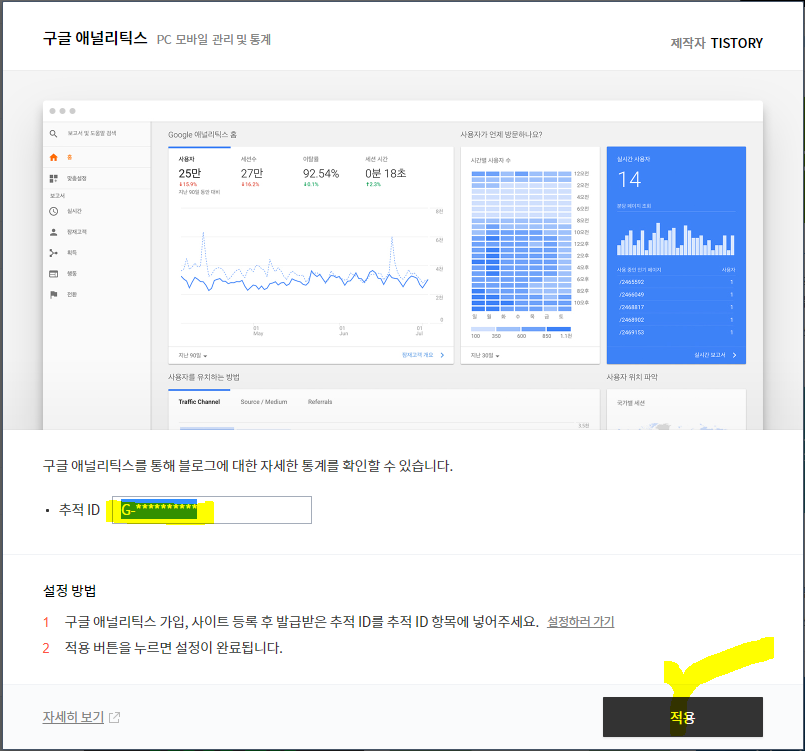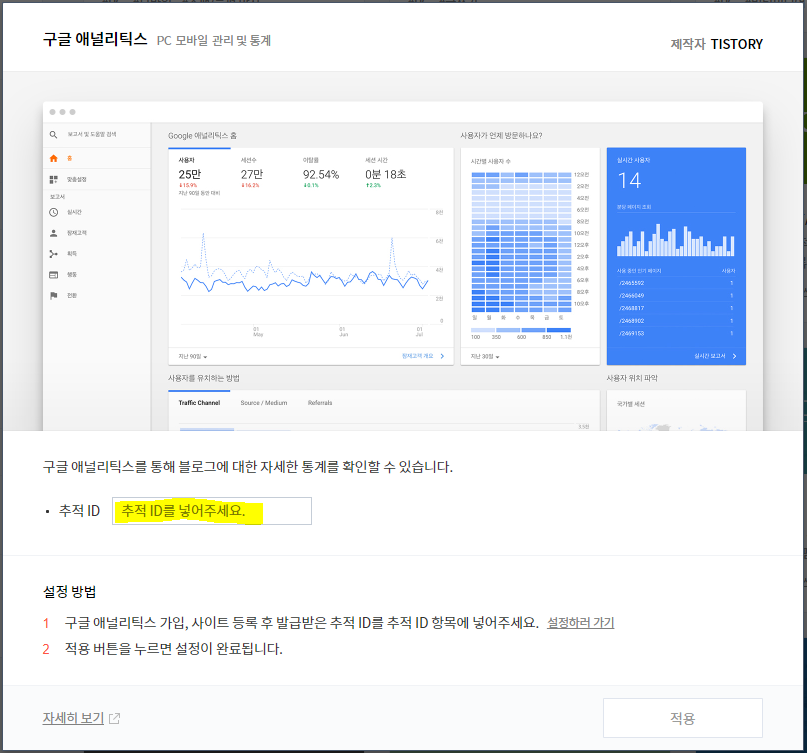 다음과 같이 티스토리와 구글 애널리틱스 두 개의 사이트에서 단계적으로 진행됩니다.