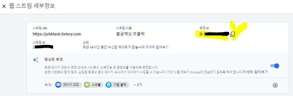 해당 스트림은 웹 스트림으로 등록되어 있으며 세부정보의 상단 우측에 있는 "측정 ID" 정보를 찾아 복사합니다.