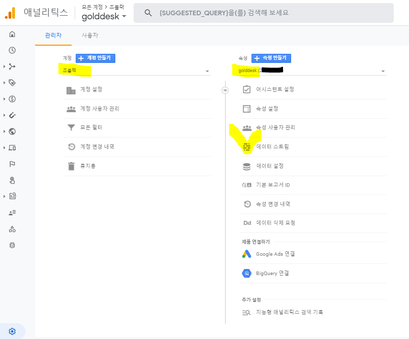티스토리를 잠시 두고 구글 애널리틱스로 이동합니다. 로긴이 되어있으면 바로 좌측 메뉴 하단에 있는 '관리'(톱니바퀴처럼 생긴 Icon)를 클릭해서 티스토리 URL이 설정되어 있는 '속성'을 찾아 '데이터 스트림'을 클릭합니다.
