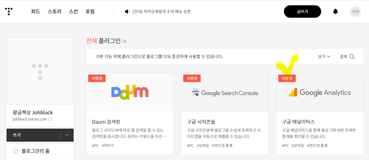 적용이 완료되면 티스토리 플러그인 리스트에 있는 구글 애널리틱스가 '사용중'으로 상태가 변경되어 있음을 확인하실 수 있습니다.