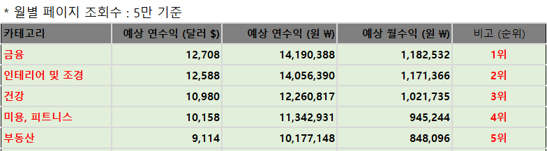 * 금융 카테고리의 경우 월 5만 페이지 뷰에 120만원 정도로 1위를 차지했네요.