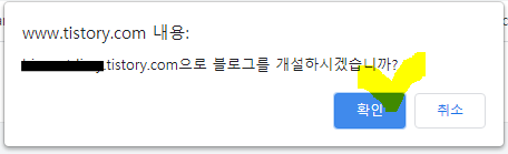 개설하기 버튼을 클릭하면 한번 더 해당 블로그를 개설할 것인지를 물어보네요 "확인" 버튼을 눌러 진행하시면 됩니다.