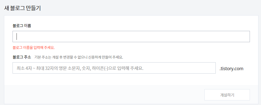새 블로그 만들기의 입력 화면은 다음과 같습니다.