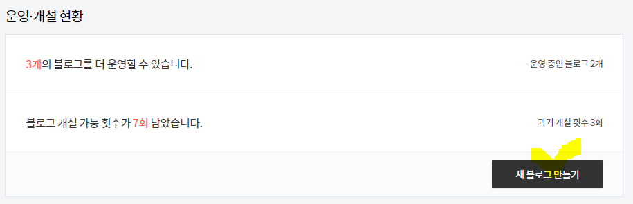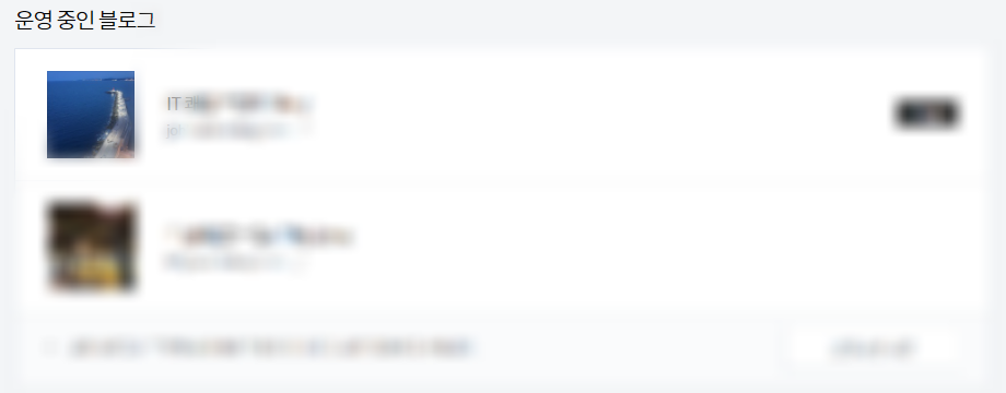 티스토리 내 블로그 메뉴 화면에는 운영 중인 블로그 그리고 운영/개설 현황 정보가 조회됩니다.
