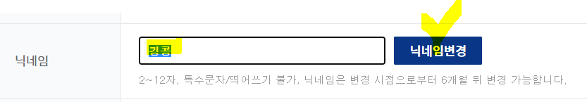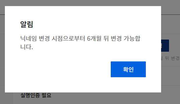 만약, 다시 닉네임을 바로 수정하시려고 시도하신다면 다음과 같이 안될 겁니다.