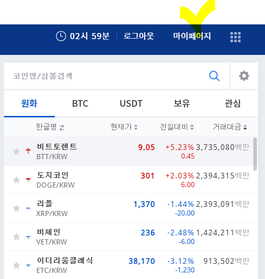 로그인이 완료되면 업비트 홈페이지 우측 상단 메뉴에서 마이페이지를 클릭해서 들어갑니다.
