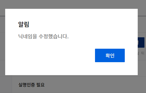 닉네임 변경하기 버튼을 누르면 "닉네임을 수정했습니다." 라는 팝업창(Pop-up)이 보이고 확인 버튼을 눌러 마무리해주시면 됩니다.