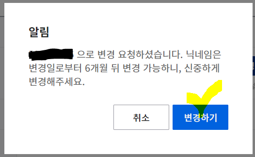 닉네임변경 버튼을 클릭하면 다음과 같은 팝업(Pop-up)에서 6개월 뒤나 변경이 가능하다고 알려줍니다. 문제없으면 "변경하기" 버튼을 눌러줍니다.