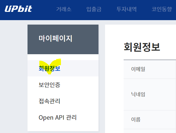 업비트 마이페이지 회원정보